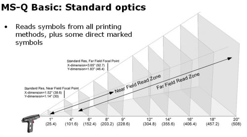 Microscan MS-Q Basic je industrijski ru?ni ?ita? linearnih (1D) i kompozitnih (2D) bar kodova, koji skenira podatke ?itanjem slike. Zbog ?vrstog ku?i?ta je robusan (opcijski dodana za?titna guma ? slika ispod) i namijenjen razli?itim aplikacijama u distribuciji paketa i industriji: automobilskoj, zrakoplovnoj, elektronskoj, farmaceutskoj i vojnoj. Na udaljenost izme?u 51 i 406 mm mo?e lako pro?itati sve standardne kodove uklju?uju?i Pharmacode Laetus, po?tanske kodove standardne rezolucije. ?i?na komunikacija integrira USB i RS-232, a be?i?na se temelji na Bluetooth tehnologiji i prijenosu putem baza ( "batch"). Potonje zna?i da ?itata? koristimo be?i?no i sa njim ?itamo podatke u kodu na razli?itim lokacijama. Kada ?elitmo podatke prenijeti, ?ita? moramo odlo?iti na konzolu. Microscan MS-Q Basic je ?ita? za rad sa duljim djelovanjem (sa jednim punjenjenjem lako ?itamo do 8000 bar kodova, uzimaju?i u obzir slobodanu internu memoriju ?ita?a 1MB) i za ve?a podru?ja rada i ?ira podru?ja ?itanja bar kodova.