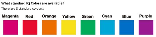 tisak na unaprijed odre?ena mjesta na naljepnici unaprijed oboji u definirane boje. Na te segmente mogu se ispisati tekst ili slika, ?ime se sprije?e ljudske gre?ke i smanje tro?kovi obrade. IQ Color naljepnice tako pove?aju efikasnost i fleksibilnost u radnim procesima i stoga su bolje od drugih metoda color ozna?avanja, kao ?to su dodatne naljepnice u boji ili flomasteri u boji, laserski ispis i ispis s inkjet pisa?a, i svakako bolje od unaprijed tiskane naljepnice u boji. Mo?emo izabrati do