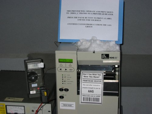 ozna?evanje v hladilnicah, izpisovanje etiket neposredno na prostem ob dobavi blaga, ozna?evanje ob nakladalni rampi ali v odprtem skladi??u, distribuciji paketov in po?iljk, hladnem skladi??u ipd. V mrazu je tiskanje etiket zaradi termalnega prenosa preko folije pogosto moteno, saj se odtis pri temperaturah ni?jih od +5?C pogosto ne pozna dovolj na etiketi. Rezultat so neberljivi podatki (deklaracija, logisti?na nalepka) vklju?no z obledelo ?rtno kodo, ki predstavljajo veliko motnjo v oskrbovalni mre?i. Za kakovosten izpis nalepk pri nizkih temperaturah potrebujemo grelec, ki ne zagotavlja zgolj kakovostnega izpisa, ampak