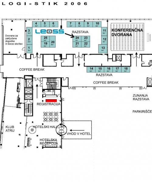 Spodnja slika prikazuje lokacijo razstavnih prostorov posameznih razstavljalcev. LEOSS d.o.o. boste obiskali na stojnici ?tevilka 24.