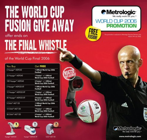 Za nakup 12 brez?i?nih ro?nih ?italnikov Metologic Voyager MS9535BT vam brezpla?no podarimo 1 Metrologic MS3780 Fusion ter uradno nogometno ?ogo FIFA World Cup Germany 2006