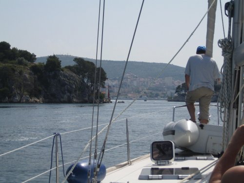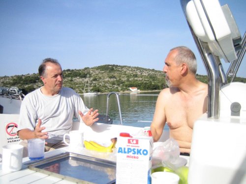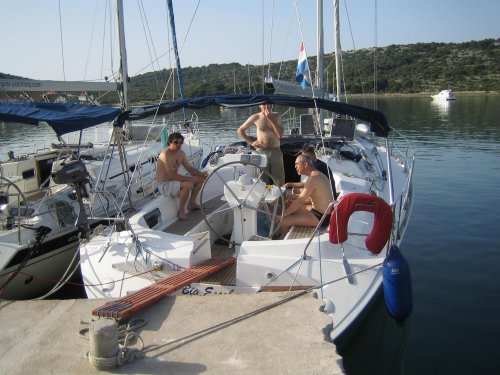 2. dan: v jutro nas je prebudil ni? kaj romanti?en ropot trajekta, ki je na otok pripeljal tovornjake z asfaltom, nekateri smo medtem ?e plavali v zelo ?istem morju in se greli na son?nih ?arkih na drugi strani zaliva. Pot nas je ta dan vodila skozi zelo prometna ?ibeni?ka vrata mimo Zlarina v ?ibenik in po sladko-slanem Prokljanskem jezeru, ki slovi po tem, da v njem ?ivi veliko morski ka?, do marine v Skradinu in slapov Krke, ki se tu izliva v Jadransko morje. Sprehod po Skradinu in kopanje v sladki vodi. V popoldanskih urah smo se po isti poti odpravili nazaj in nadaljevali mimo Primo?tena ter se zve?er zasidrali v najpopularnej?i in najbolje opremljeni marini na Jadranu ?