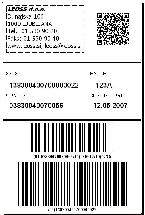 SSCC (Serial Shipping Container Code), ki je unikatna za vsako enoto in vsebuje: