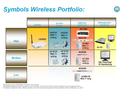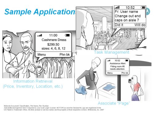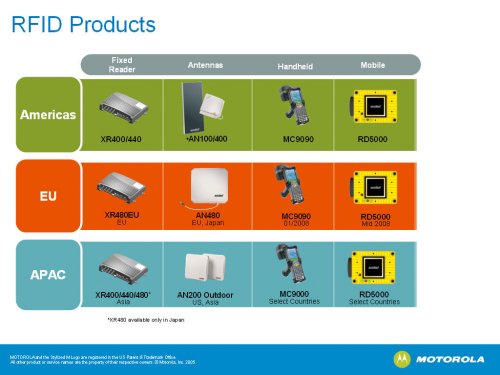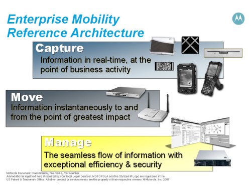 Motorola veliko stavi na prihodnost brez?i?nega povezovanja in upravljanja s podatki. Zato so razvili Wireless Next Generation (WiNG), ki zdru?uje tehnologije brez?i?nih povezav in oddaljen centraliziran nadzor nad napravami v omre?ju. Razvili so Access Point, namenjen zunanji rabi v ekstremnih pogojih (temperaturni interval med -30?C in + 55?C) z dodatkom za mo?ne vetrove (do 200 km/h). Izpostavili so tudi ?Mesh Networking? - povezovanje Access Pointov med seboj, s ?imer se uporabnik znebi dragega ethernet kablovja. Govora je bilo tudi o tehnologiji RFID. V okviru tega so argumentirali Motorolino stali??e, da se o RFID veliko govori, malo pa naredi. RFID se v ZDA razvija precej hitreje kot v Evropi, razlog ti?i v zategnjenih oz. zahtevnih EU zakonodajnih omejitvah. EU regulativa omejuje uporabo RFID tako, da npr. v enem skladi??u zahteva uporabo najve? 10 RFID ?italnikov naenkrat z delovanjem na podlagi metode ?listen before talk?. Motorola zato razvija zgolj RFID ?italnike, delujo?e v standardnem obmo?ju EPC Global, na UHF frekvencah, z uporabo katerih se dose?e ve?ji domet pametnih nalepk oz. tagov. Z zni?evanjem frekvence Motorola sicer lahko dose?e tudi uspe?en zajem podatkov pametnih nalepk z vode ali ?eleza, vendar se domet drasti?no zmanj?a ? na vsega 2 cm. S 1.10.2007 naj bi najve?ji evroski trgovec, dru?ba MetroGroup (www.metrogroup.de) zahtevala ozna?evanje vseh palet s pametnimi nalepkami (RFID oddajnik + natisnjena logisti?na nalepka z SSCC kodo). V imenu svetovne po?tne organizacije je v ?paniji stekel projekt (?panska po?tna dru?ba Correos), ki vklju?uje 300 RFID ?italnikov, s katerimi sprejemajo podatke na razli?nih koncih dr?ave in sledijo po?tnim po?iljkam, imajo nadzor nad ?asom, ki je potreben za distribucijo po?iljk. Vse skupaj podrobno opazujejo - pripravljajo analizo, s katero bodo ovrednotili delovanje tega RFID sistema. ?e bo projekt uspe?en, bo dal zeleno lu? za uporabo RFID tehnologije v svetovnih po?tah.