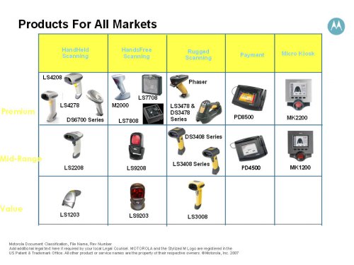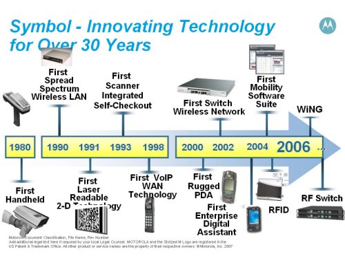 Natanko pred letom dni sta se dru?bi Motorola in Symbol dogovorili o prevzemu, s katerim je Motorola za 3,9 milijarde USD kupila Symbol. Slednji tako ?e ve? kot pol leta deluje kot Motorolina podru?nica in predstavlja temelj njenega delovanja na podro?ju omre?ij in sistemskih poslovnih re?itev. V Symbolu, ki velja za pionirja na podro?ju avtomatske identifikacije in mobilnega zajema podatkov, zagotavljajo, da bodo ?e naprej stremeli k popolnosti, ko gre za mobilne poslovne re?itve in proizvodnjo njihovih ro?nih ra?unalnikov in ?italnikov kot tudi naprav, s katerimi vzpostavljajo brez?i?na omre?ja ter RFID ?italnikov.