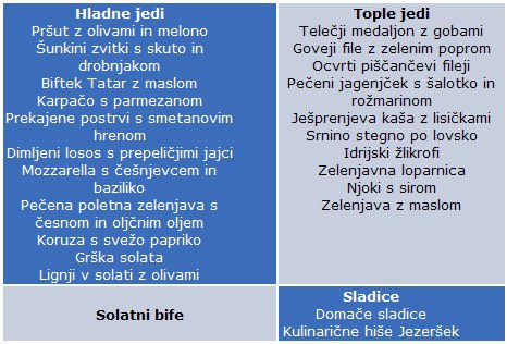 Na nobenem izmed devetih dosedanjih Linux dnevov ?e nismo tako dobro jedli! To je teza, ki jo bodo sku?ali dokazati strokovnjaki za kulinari?ne u?itke iz Hi?e kulinarike Jezer?ek. Meni - kosilo se bohoti z naslednjimi dobrotami (pove?aj sliko):