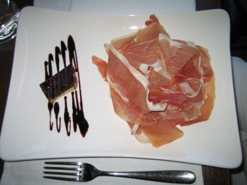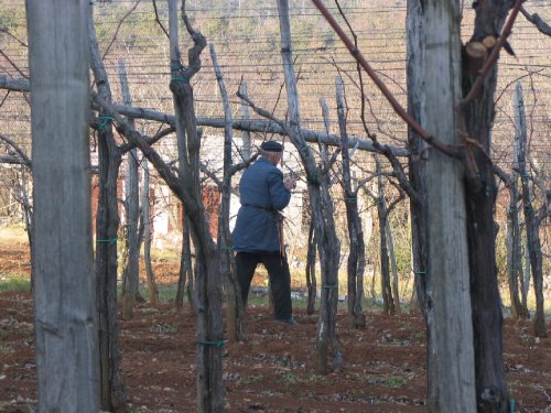 Takoj nas je premamil prijeten vonj, skladen s pokrajino (obrezovanja trte (slika 13) in dolgoletno tradicijo zorenja pr?uta - na kavljih vise?ih opojnih na kra?ki burji su?e?ih svinjskih nog ? slastnih pr?utov, ki smo jih posku?ali v kombinaciji doma?ega kruha, napojenega s teranovim likerjem in ?li?ko olj?nega olja. Za vegetarijance so namesto pr?uta pripravili mle?ne izdelke drobnice. Ob kozar?ku terana in kraljevi vodi se je jed ?e bolj prilegla. Ob zaklju?ku obiska ?e kava (macchiato). Mimogrede, Devin nas je tako zelo prevzel, da smo od tam le s te?avo od?li, zato zamudili voden ogled pr?utarne in se namesto tega takoj predali u?ivanju pr?uta iz prve roke ? Kobjeglava je kraljestvo pr?uta