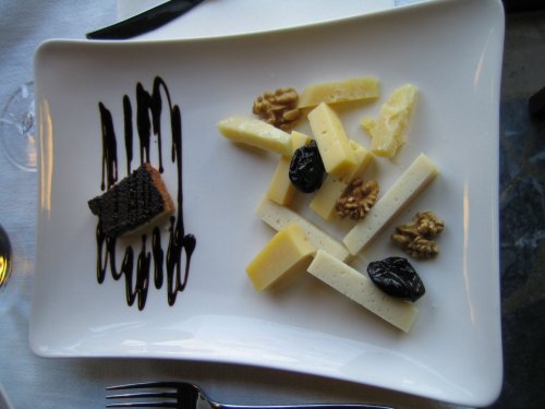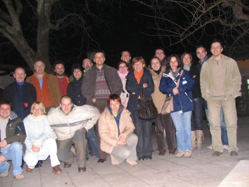 (ve?). Tam so po uvodnem poku?anju teranovega likerja v kombinaciji z govejim, sirovim ali tuninim carpaciom za?ele te?i klasi?ne debate o izvoru imena teran (ta rano ? zgodnje vino ali terra rossa, kar zagovarjajo Italijani), o poimenovanju krajev Tomaj in Dutovlje (kraja se dr?ita povsem skupaj, pri ?emer naj bi Tomaj izviral iz ?to (je) moje?, Dutovlje pa iz ?do tu (je) tvoje?), o nazadnje prebranih knjigah, itd. Naslednji hod je razkril joto ali gobovo juho iz jur?kov, sledili so njoki z orehi v sirovi omaki, za ?etrto predjed pa smo imeli rezance z jur?ki. V kombinaciji s teranom je zelo teknila tudi glavna jed ? govedina ali pe?ena zelenjava ter lazanja z oljkami in teranom. Poobedek: hru?ka v teranovem likerju in sirov ?trukelj z orehi. Kulinari?ni u?itki so se vili okrogle ?tiri ure vse do 21h, ko je bilo ve?erje ob u?ivanju tradicionalnega sorbeta konec. Skupinska fotografija (slika 22) in epilog z zabavo na avtobusu.