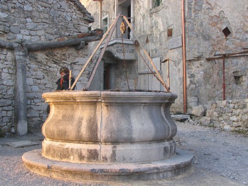 (ve?). ?e Spacalovo grafiko primerjamo s posnetkom dejanskih testiranj termalnih glav, opazimo, da je tovrstna interpretacija na mestu (slika 21). Po obisku galerije in poznogotske cerkve sv. Danijela, katere zvonik predstavlja ?kofovsko pokrivalo (slika 16), smo postopali po va?kem trgu z javnim vodnjakom, odkrivali ?are spodnjega (za ?ivali in orodje) in zgornjega dela kra?ke hi?e (kuhinja s kuri??em), narejene izklju?no iz kamna (tudi ?lebovi so iz skrilavcev).