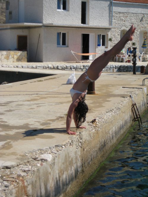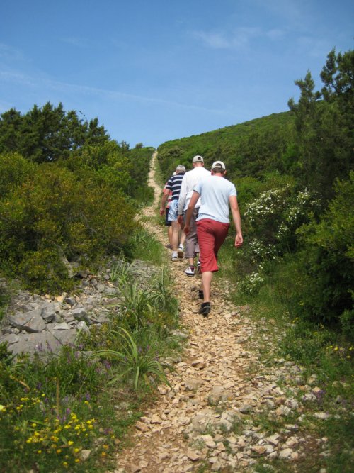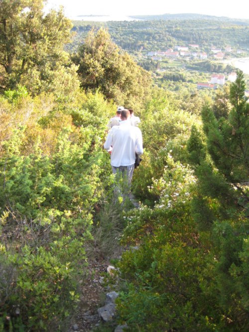 Bo?ava (ve?) pozno popoldan. Del odprave na sprehod mimo cerkve s pokopali??em, kjer smo sre?ali lokalni starej?i par, katerega mo?ki nam je zaupal, da je za vzpon ?ez hrib v Soline, obmorski kraj na drugi strani, svoj ?as potreboval vsega 25 minut. Spogledali smo se in se takoj odlo?ili, da velja poskusiti. Pa smo se za?eli vzpenjati. ?as je tekel, skozi pu??avo in go??avo ni bilo lahko. Stara kozja steza je postajala vse o?ja, bujno grmi?evje vse bolj razposajeno in razpaseno. Zakrivalo je stezo, ki se je v tem ?asu spremenila ?e v stezico. O?itno je postalo, da le redki hodijo tu, saj je nedale? pro? asfaltirana cesta, po kateri vozi tudi avtobus. Skratka, na? 25-minutni sprehod se je prelevil v pohod, d?ungelsko odpravo, ?e ho?ete. V smeri iz Bo?ave ?asa nismo merili, nazaj iz Solin pa?. Takrat je kazal nekaj ve? od 30 minut, ?etudi smo precej hiteli nazaj, da bi se vrnili ?e pred mrakom. O?itno dalmatinski ?as te?e precej po?asneje od na?ega. Ampak to ?ivkajo ?e galebi na otokih. V Solinah (ve?) ni bilo ?ive du?e. Bil pa je ?balin plac?. Odigrali smo partijo balinanja, v kateri sta bila Matja? in Ga?per ob pravi?nih meritvah kapitana Francija in pomo?nika Amadeja bolj?a od Bernarda in Janeza z 8 proti 7. Vrnitev v Bo?avo po isti, zara??eni poti. Po manj?i ve?erji, so se nam ob bok privezali prijatelji na?ega barbe in se odvezali ?ele zgodaj zjutraj.