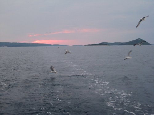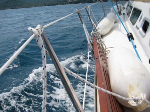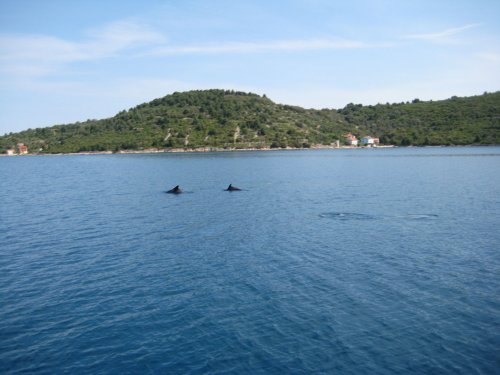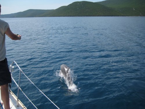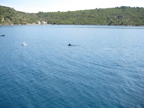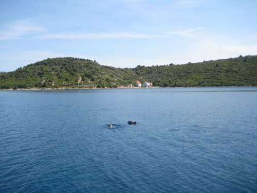 Pot smo nadaljevali ob vzhodni strani otoka, kjer nas je tik pod Velo Stra?o presenetilo pet odraslih delfinov, katerih dihanje/sopihanje/pr?enje je bilo mo? sli?ati zelo dobro. Prekrasni ?dolphin watch?. Jadrnico smo ustavili, ugasnili radio, se zbrali na krovu, bliskali s foto aparati in ?akali na naslednji skok iz vode. Delfini ob desnem boku, obrat posadke, delfini gredo spodaj pod jadrnico, zbor?ek na krovu se obrne vstran, na levo, naprej, nazaj, vsi opazujemo, zbrano, slo?no, z usklajenimi gibi. Mir in ti?ina na krovu vzpostavljena nemudoma. Takoj po nadaljevanju smo nekateri u?ivali v ?ajanki.