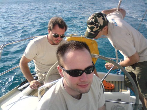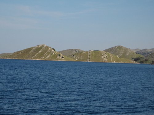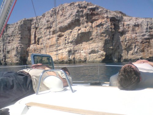 Mirna dalmatinska glasba je botrovala brezvetrju, ki nas je popeljalo mimo visokih strmih sten in Pi?kjere do otoka Lavsa, kjer smo se najbolj zagrizeni kopali v morju, ki je zaradi hladne pomladi letos ob tem ?asu ?e precej mrzlo: 18?C. V nadaljevanju proti Tela??ici (ve?) bli?nje sre?anje druge vrste z regato (sre?anje tretje vrste smo do?iveli ?e isti ve?er v Saliju, kjer je regata preno?ila), ?olsko vezanje na bojo v uvali Tripuljak. Kornati so v tem ?asu verjetno predvsem zaradi velike koli?ine padavin obarvani v zgodnje pomladansko zeleno barvo olu??enih pistacij. Eden od sojadralcev je celo za?el ?iriti zgodbo o vseprezentnih olu??enih pistacijah, ki naj bi le?ale povsod naokoli, vendar smo ?e v ?tartu vedeli, da gre za travo in grmi?evje. Kosilo: testenine z gola?em, kruhom in paradi?nikovo omako s ?i?eriko in sirom. Plovba se je nadaljevala proti oto?kemu paru Veli in Mali Ra?ip (seznam hrva?kih otokov tukaj). Oba slovita po ?e omenjenih strmih stenah - klifih, iz roba katerih nekateri pogumne?i ska?ejo v vodo. Na splo?no je rob Kornatov posejan z odrezano zahodno steno. Ko smo pluli mimo ostankov lanskega (2007) katastrofalnega po?ara na Kornatih (ve? o tej temi), se je na LCD televizorju, ki jih zadnje ?ase vgrajujejo v osrednje salone jadrnic, odvijala VN Tur?ije. Slednjo smo nekateri privr?enci hipoma spremljali.