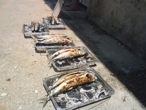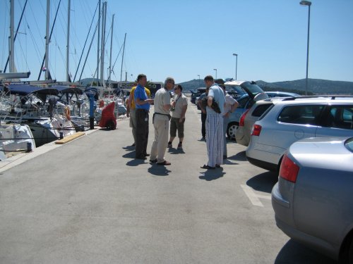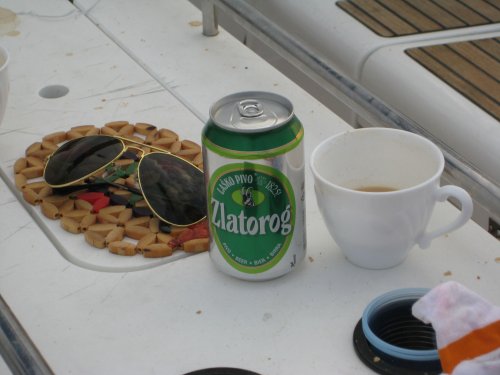 V lepem son?nem vremenu, smo se LEOSS-ovci zbrali ob jadrnici (Jeanneau Sun Odyssey 43 (ve?), imenovani Orka, katere privez je v ju?ni marini Biograda na morju (ve? o kraju), jo napolnili z vsemi potreb??inami za pot in si pred izplutjem privo??ili kosilo v obliki ocvrtih lignjev ali kalamarov na ?aru, blitve in krompirja v eni od dobro skritih lokalnih gostiln, za katero smo izvedeli od na?ega barbe, najmlaj?ega, a hkrati najizku?enej?ega ?lana posadke, ko gre za ?tevilo prejadranih navti?nih milj. Njegov nasvet o izbiri kosila se je obrestoval, tako da so lignji ?e dolgo plavali v zna?ilnem lokalnem belem vinu, ki po videzu zaradi motnosti spominja na medico. Sladica: borovnice, oplemenitene s teranom (poreklo ?abnica pri Kranju) ter doma?a slivovka (poreklo Novi Sad).