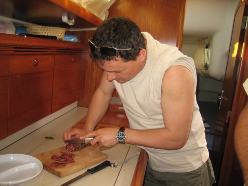 Na?a jadrnica Orka se je ob pomo?i vetra (17 vozlov) s hitrostjo 5 vozlov pognala mimo Vrgade (ve?) in skozi Murtersko morje odplula na jug Kornatov (ve? o nacionalnem parku) ter se v soju son?nega zahoda privezala na skrajni ju?ni del otoka Kornata, na rt Opat. Med uvodnimi vetrovnimi sunki nam je edini novinec na jadranju (?seaman recruit?) predaval teorijo o pravilih, ki vladajo na morju. ?tiri ure po kosilu v Biogradu oziroma dve uri pred prihodom na rt Opat sta dva ?lana posadke poskrbela za prigrizek, ki se je sprevrgel v ve?erjo, medtem ko je tretji ?lan posadke preizku?al na?e sommelierske sposobnosti. Pri pripravi prigrizka je prvi ?lan posadke s finomehani?no natan?nostjo urarja ali optika lo?eval kro?nike, medtem ko je drugi kuharski mojster ?heavy duty? no?u (IP65) navkljub z mikronsko natan?nostjo rezal paradi?nik, papriko, sir ter pr?ut in ostale mesne dobrote. Naj povemo ?e to, da je bilo vzdu?je polno smeha in ob?asnega re?anja, v ozadju katerega se je tu in tam sli?ala jadralska glasbena klasika: the Doors, Jack Johnson in Amy Winehouse. Kombinacija vsega na?tetega nam je tako teknila (sodelavci/prijatelji smo ob tem pokazali izredne sommelierske sposobnosti), da smo se le s te?avo zadovoljili z pre?kanjem ciljne ?rte prvega dne ? rt Opat. Ob tem naj dodamo, da se omenjeni trojec ne brani z enako finomehani?no natan?nostjo pomagati drugim posadkam, ko gre bodisi za jadranje samo bodisi zgolj za pripravo narezka.