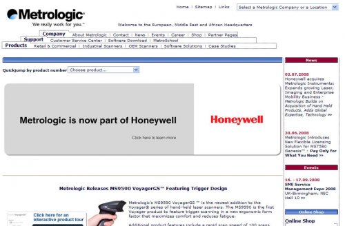 (ve?), pove?uje Honeywell svoj tr?ni dele? na podro?ju avtomatske identifikacije in mobilnega zajema podatkov z nakupom dru?be Metrologic, ki slovi kot pionir na tem podro?ju (s skoraj 500 patenti), saj ?e od leta 1975 sodi v sam svetovni vrh, ko gre za razvoj in proizvodnjo laserskih ?italnikov ter vpeljevanje inovacij. Za Metrologic in njegov bogati program (skenerjev za ?rtno kodo), ki bo raz?iril zmo?nosti obstoje?e ponudbe znotraj skupine Honeywell Imaging and Mobility (slednja je del skupine Honeywell Security), je Honeywell od?tel 720 milijonov ameri?kih dolarjev (takrat dobrih 457 mio ?). Za nakup se je "the Big Red Machine" odlo?ila tudi na podlagi obetavnega polo?aja na trgu, saj je Metrologic prisoten v 110 dr?avah sveta (z vrsto predstavni?tev) ter ve? kot 64% prometa ustvari zunaj ameri?kega tr?i??a.