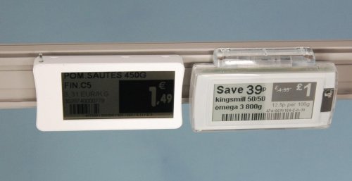 Primerjava elektronskih cenovk Pricer (na desni) s konkurenco (SES - na levi). Berljivost cenovke ocenite sami [slike posredoval Pricer].