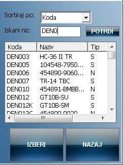vpogled v ?ifrant artiklov na terminalu (izpis podatkov: naziv, cena, zaloga artikla ipd.),