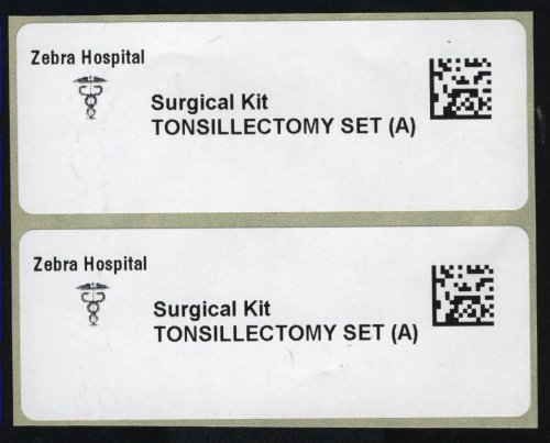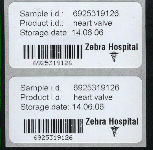 Zgoraj: vzorec nalepk Zebra Z-ULTIMATE? 3000T WHITE, vzdr?ljivih sinteti?nih nalepk, s katerimi zagotovimo sterilnost