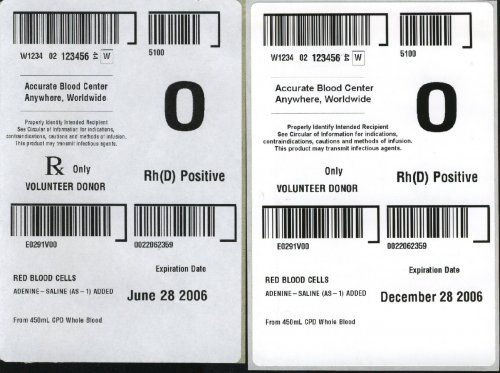 Zgoraj: vzorec nalepk Zebra 8000T Blood Bag za ozna?evanje krvi