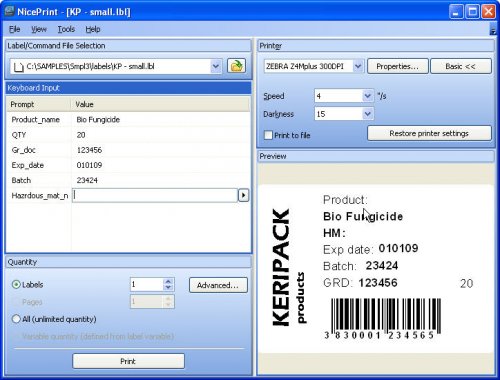 vmesnik za tiskanje etiket. Enostavnost uporabe NicePrint progama omogo?a vsakodnevno tiskanje vnaprej oblikovanih, shranjenih etiket na katerikoli tiskalnik dostopen v omre?ju. NicePrint je eden od modulov celovite re?itve za oblikovanje etiket, ?rtnih kod in RFID etiket NiceLabel Suite