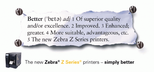Jednostavna integracija u bilo koji ERP (XML potpora), kakav god tip etiketa do veli?ine A5, bilo koja printer traka ( tinta na unutarnjoj ili vanjskoj strani), programski jezici suparni?kih printera, bolja povezanost itd. su su?tinska svojstva novih Zebrinih industrijskih printera serije Z. Ako ste do sada upotrebljavali printere drugih proizvodja?a, osobito zbog povoljnijih cijena repromaterijala i to unato? slabijem ispisu, sada ?e biti druga?ije. Nova serija Z korisnicima omogu?uje o?uvati postoje?i repromaterijal i promijeniti samo printer ? i?i na najboljega ? na Zebru. Tako mo?emo bilo kad osigurati najbolje ?itljiv ispis bar kode, i istodobno zadr?ati postoje?i repromaterijal.